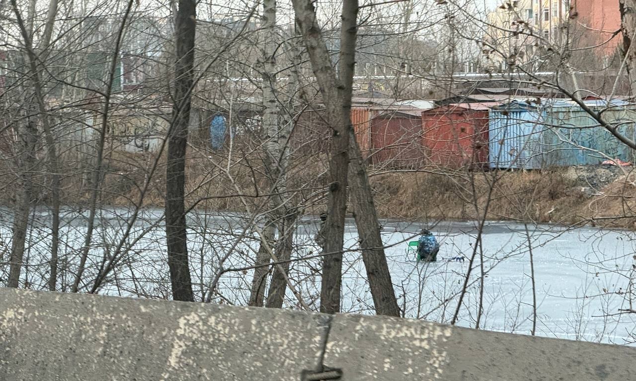 Охота пуще неволи. Махнув рукой на собственную жизнь, некоторые рыбаки уже поспешили на неокрепший лёд абаканской дрены. Эти фотокадры сделаны журналистом РТС на улице Крылова.